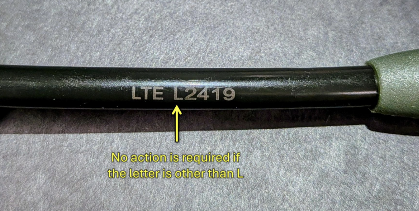 Vi har registreret et problem med den eksterne Artemis-antenne. På nogle antenner er antennebasen ikke korrekt fastgjort til antennens dækrør, hvilket kan medføre, at røret løsner sig. Dette problem er specifikt for produktionsbatchen af L-serie-antenner. For instruktioner i, hvordan du identificerer en L-serie-antenne, henviser vi til billedet nedenfor.