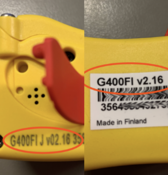 Die erste Kennzeichnung zeigt das Halsbandmodell. In diesem Beispiel ist es G400FI, gefolgt von der Halsbandversion, in diesem Fall v02.16.