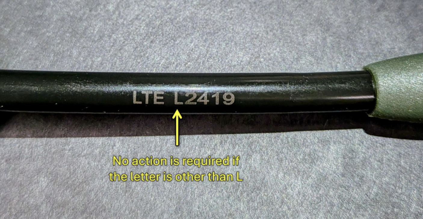 We have detected an issue with the Artemis external antenna. In some antennas, the antenna base is not properly attached to the antenna's cover tube, which may result in the detachment of the tube. This issue is specific to the L-series antenna production batch. For instructions on how to identify the L-series antenna, please refer to the picture below.