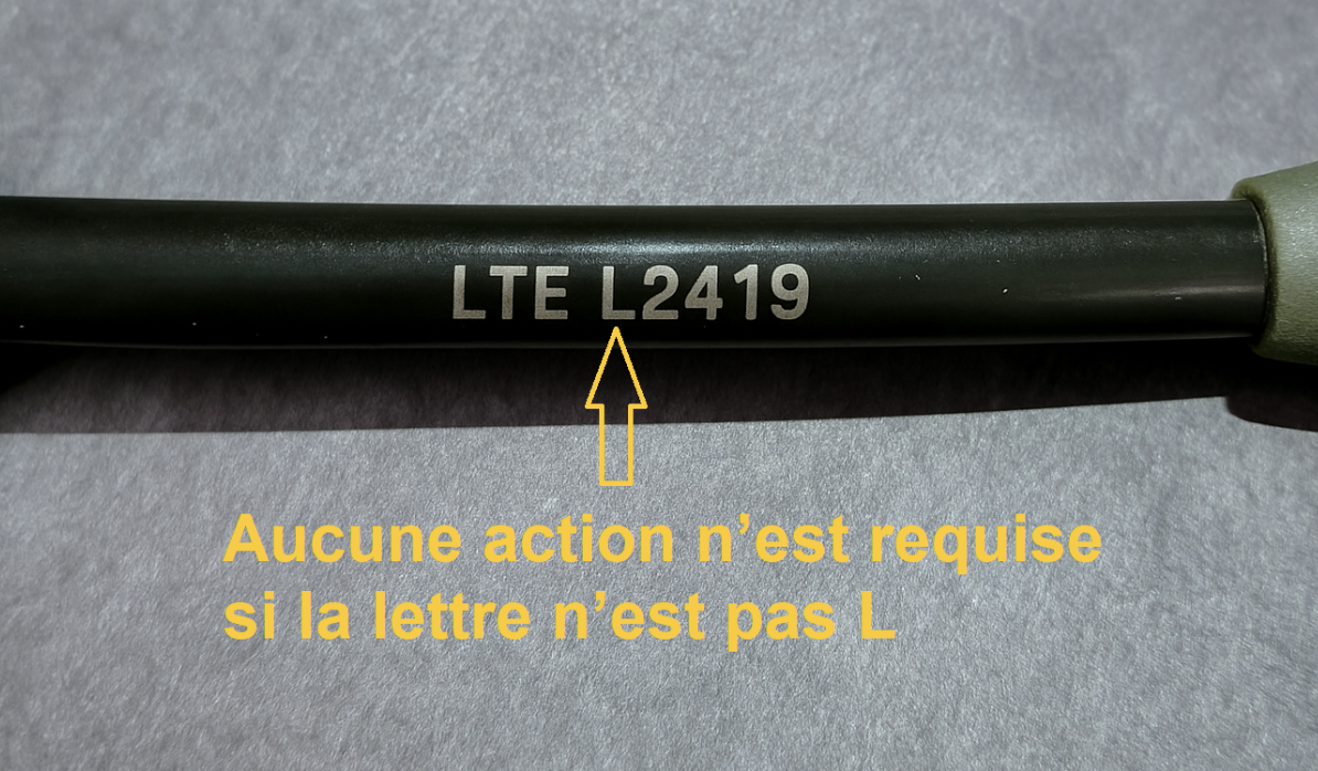 Nous avons détecté un problème avec l’antenne externe Artemis. Sur certaines antennes, la base n’est pas correctement fixée au tube de protection, ce qui peut entraîner son détachement. Ce problème concerne uniquement le lot de production de l’antenne série L. Pour savoir comment identifier une antenne de la série L, veuillez vous référer à l’image ci-dessous.
