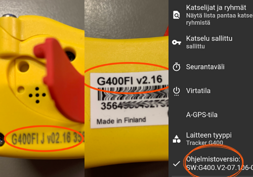 Le premier marquage indique le modèle du collier. Dans cet exemple, il s’agit de G400FI, suivi de la version du collier, qui est ici v02.16.